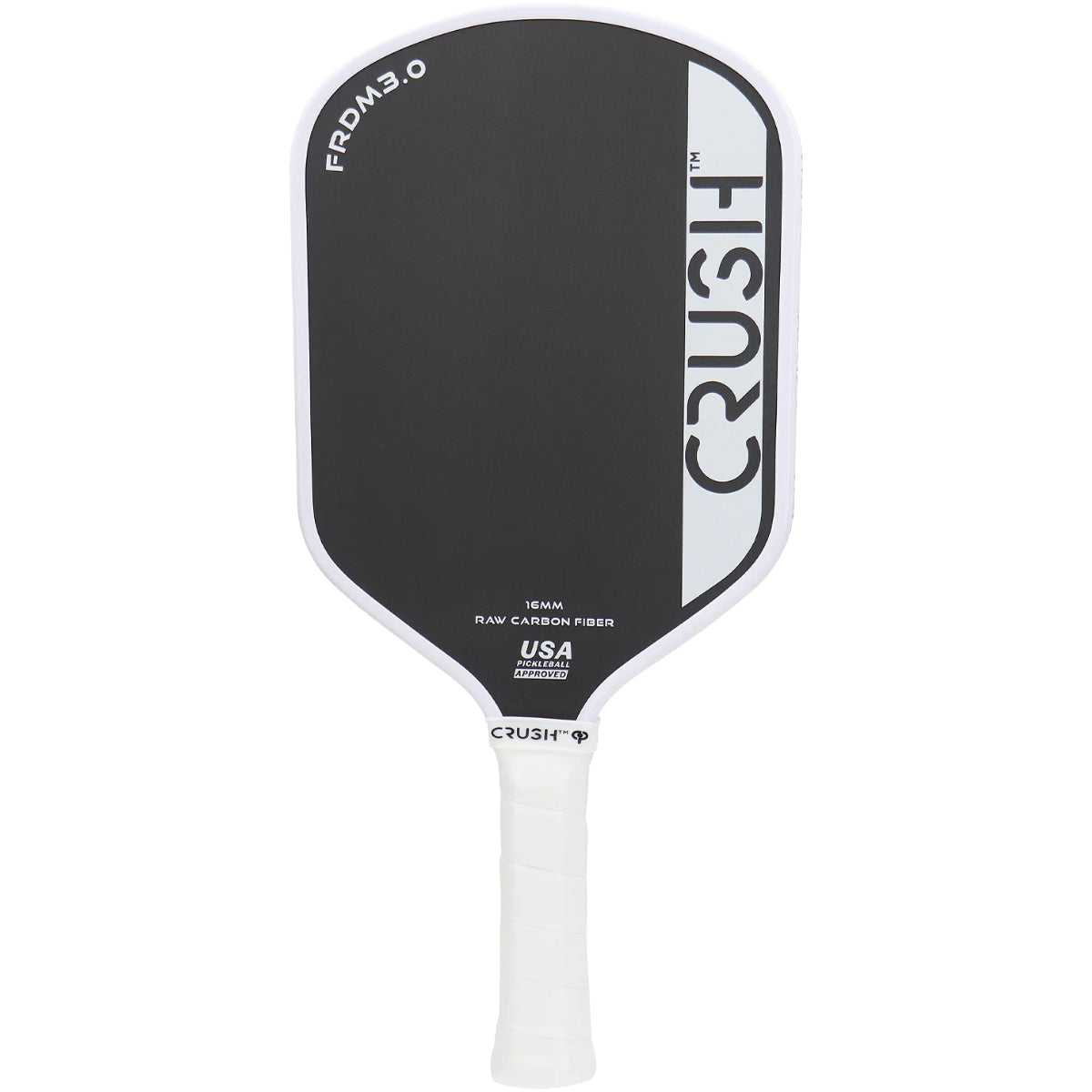 High-Performance pickleball paddle for competitive and pro-level players; CRUSH FRDM-3 is a 16 mm pickleball paddle featuring thermoform unibody design and raw carbon fiber surface that maximizes power, spin, and control